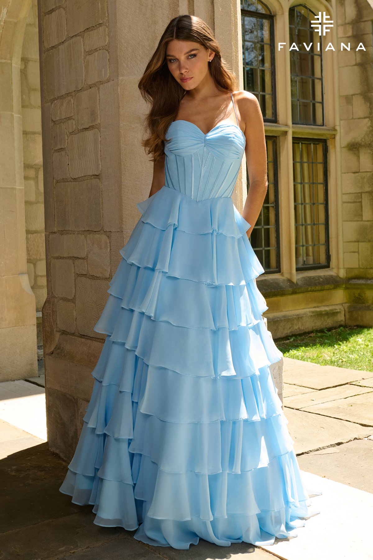 Chiffon Ball Gown With Tiered Ruffle Skirt And Corset Top