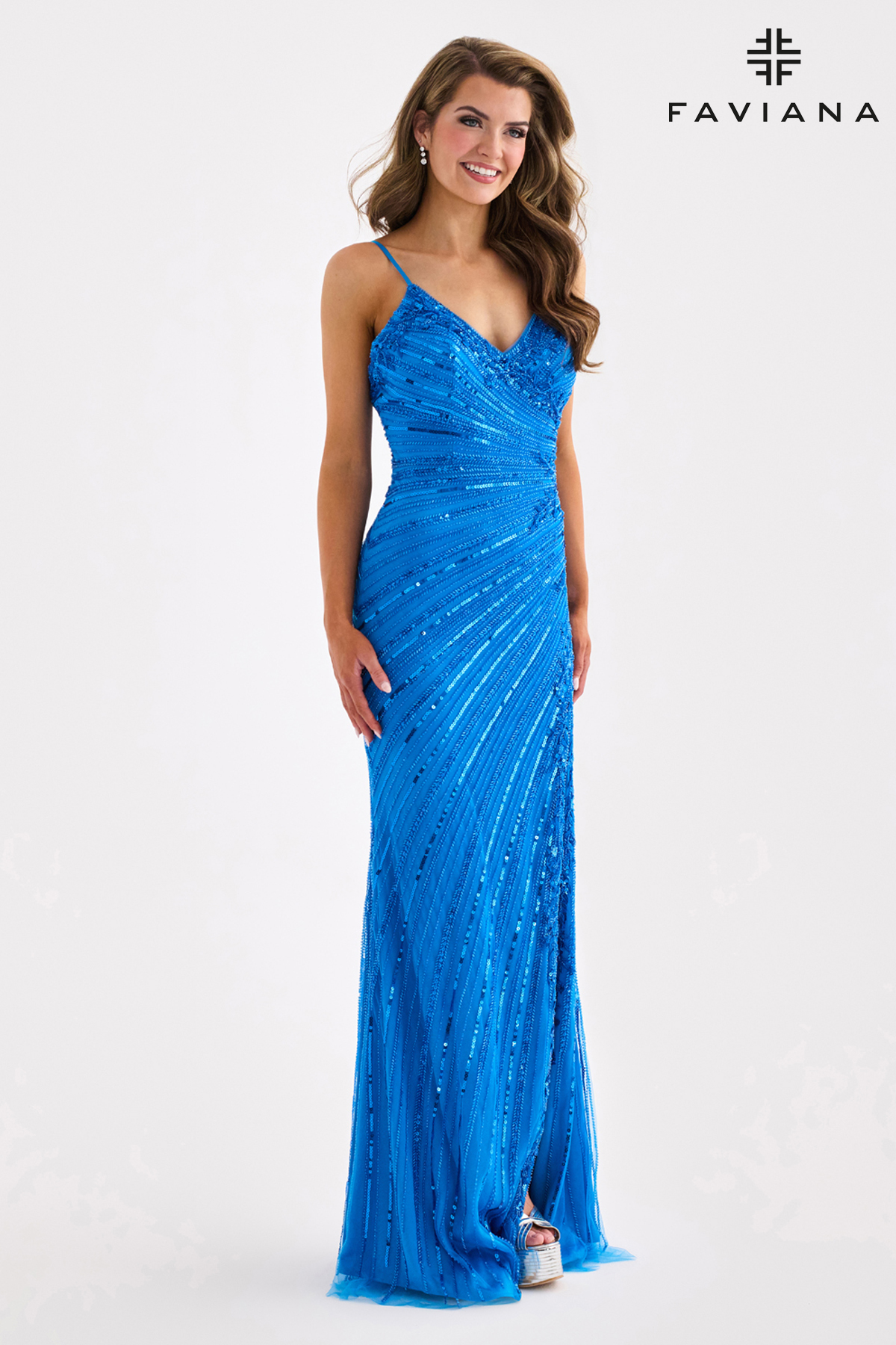 V-Neck Gown With Linear Beading And Appliqué Detailing